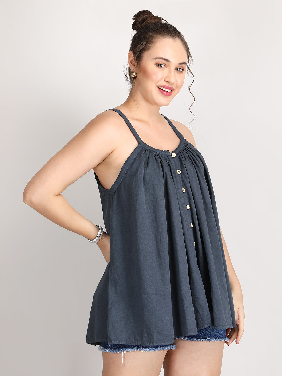 This top is crafted from 100% organic cotton, creating a lightweight, airy fabric perfect for warm summer days. Stylish and refined, its hue of grey exudes sophistication, making it a great choice for effortless summer style.